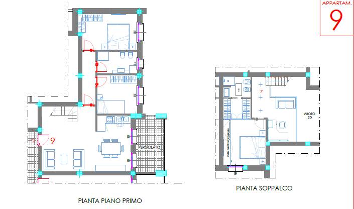Al piano primo la soluzione n.9, dove troviamo ingresso ampio soggiorno, cucina a vista con zona pranzo e accesso a pergolato ideale per pranzare all'aperto, 2 camere da letto, bagno, scala di accesso al p.sup.re living con camera da letto e ulteriore bagno.