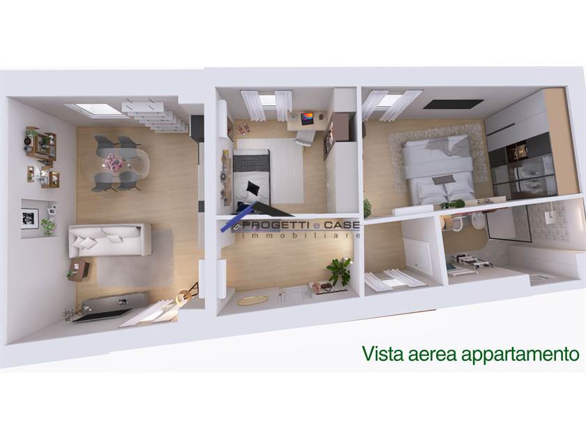 Soluzione n.7 - Piano primo composta da: zona ingresso, ampio living con cucina a vista, camera matrimoniale, camera singola, bagno, terrazzo privato di 12 mq., 2 posti auto pertinenziali.