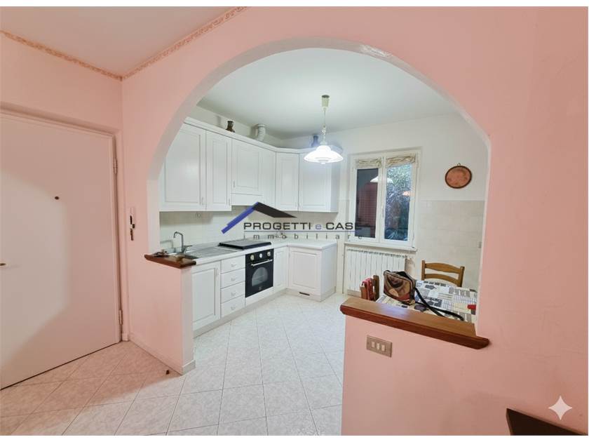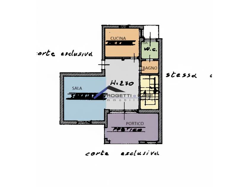 Attualmente è suddivisa in : ingresso, sala doppia, portico esterno sul giardino , cucina abitabile e servizio.